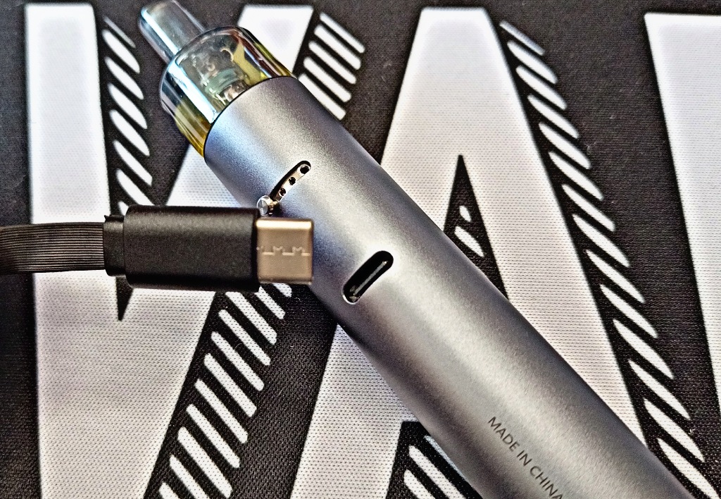 La batterie dispose d’une autonomie de 1500 mAh et délivre une puissance allant de 8 à 18 watts. Elle s’active ou s’éteint simplement en cliquant 5 fois sur le bouton fire. Le voyant situé au dessus du bouton feu vous indique le niveau de charge en fonction de sa couleur : vert de 100% à 66%, bleu 66% à 33%, rouge < 33%. La batterie se recharge en une heure par le biais du port USB-C si vous utilisez un adaptateur qui délivre un courant de 1.5A d’intensité. La batterie est bien entendu équipée de toutes les protections électroniques indispensables.